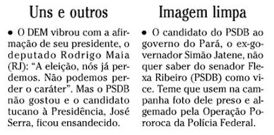 Na mesma coluna de hoje, de O Globo, mais duas notas. Uma delas tenta encher a bola de Rodrigo Maia, presidente do DEM, sobre a sua infeliz declaração. É uma mentira das mais ridículas, haja vista a reação de nomes muito mais importantes do partido do que o deputado carioca, de total apoio à candidatura da oposição. Na segunda nota, uma tentativa desesperada de "queimar" um senador tucano que não está cedendo o lugar para Valéria Pires (DEM-PA), esposa no deputado federal Vic Pires(DEM-PA), que exige que ele não busque a reeleição e ceda a vaga. Jogo sujo da pior espécie. Jogo petralha. Não há mais dúvidas que existem dois DEM e um partido sem voz de comando. Lamentável um partido do porte e da importância do DEM, que sempre teve na articulação política a sua maior força, entregar os seus destinos para um presidente sem as mínimas condições e o mínimo equilíbrio para tamanha tarefa.