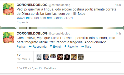 Coronel, acho que as tuitadas todas durante o dia foram apropriadas, corretas, só faltou talvez a advertência em algum momento, conhecendo essa gentalha moralmente podre, de que seria inaceitável ocorrer exploração política, o que finalmente se verificou com a divulgação da foto estilo Benetton. Fica a lição. A gentalha não tem mesmo pruridos nem limites.